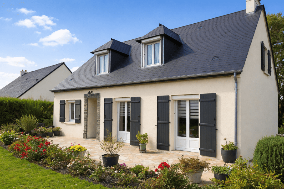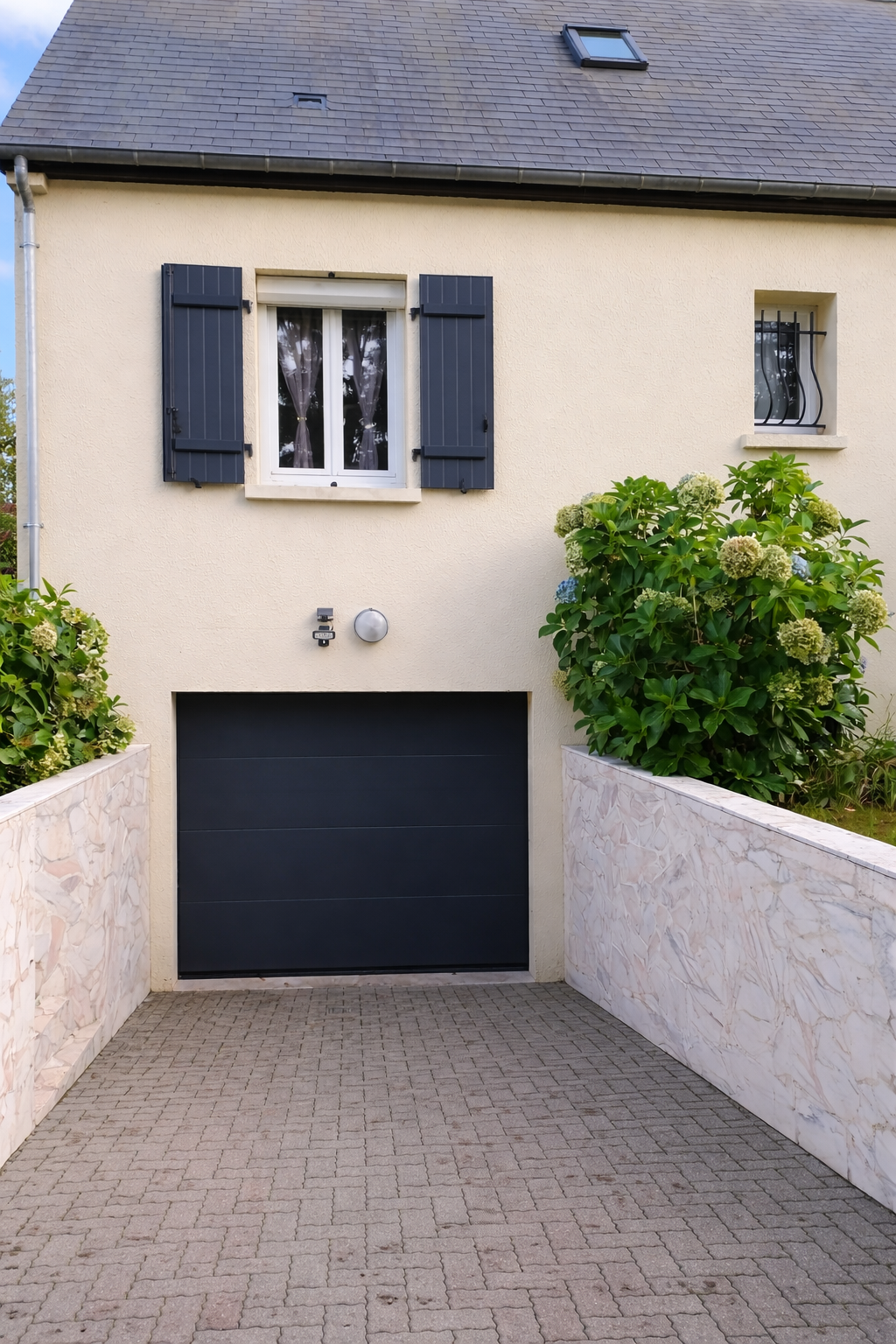 Pour compléter cette rénovation, le client a opté pour une porte de garage sectionnelle plafond, idéale pour optimiser l’espace intérieur, contrairement à une ouverture latérale. Les volets battants en aluminium, quant à eux, permettent de conserver le charme authentique de la maison tout en éliminant les inconvénients liés au bois.